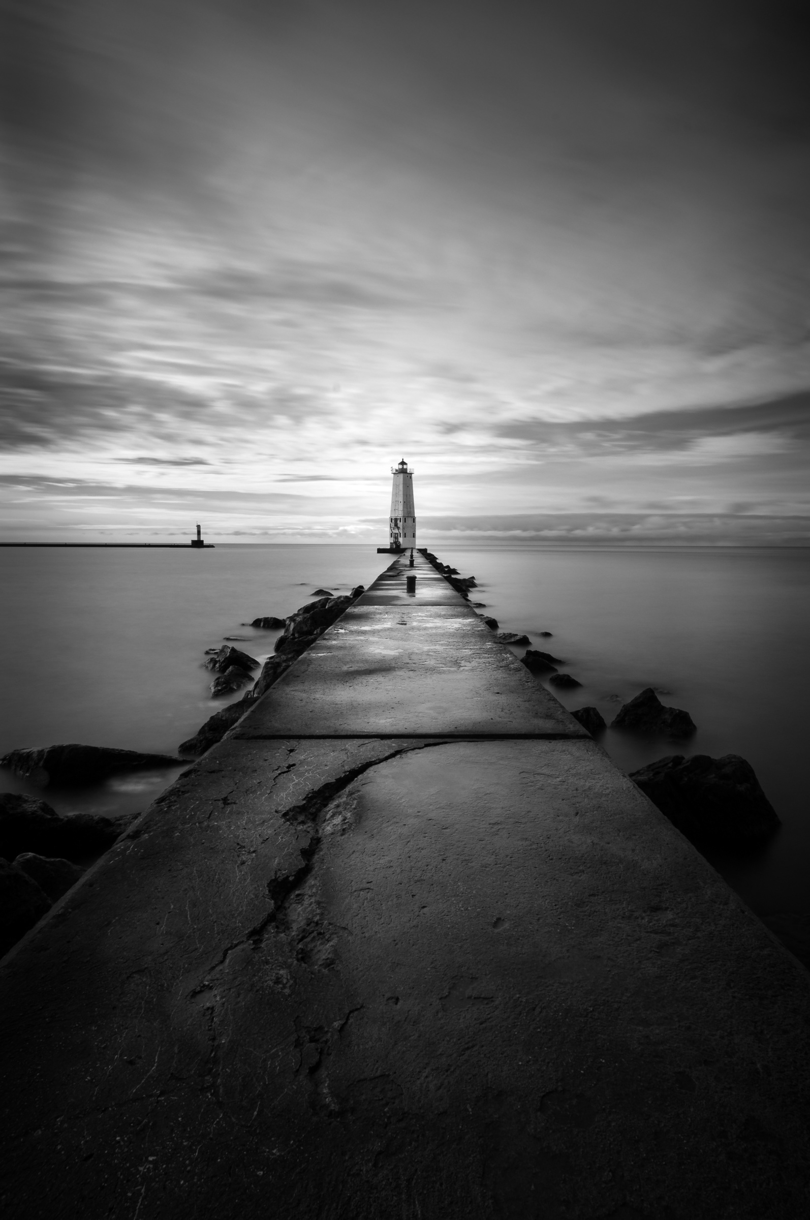 Frankfort Lighthouse, November 2021. It was unusually warm and calm on this particular day. The lighthouse is within easy walking distance from the City of Frankfort. Water from Betsie Lake flows through the channel into Lake Michigan. Exposure time: 30 seconds.