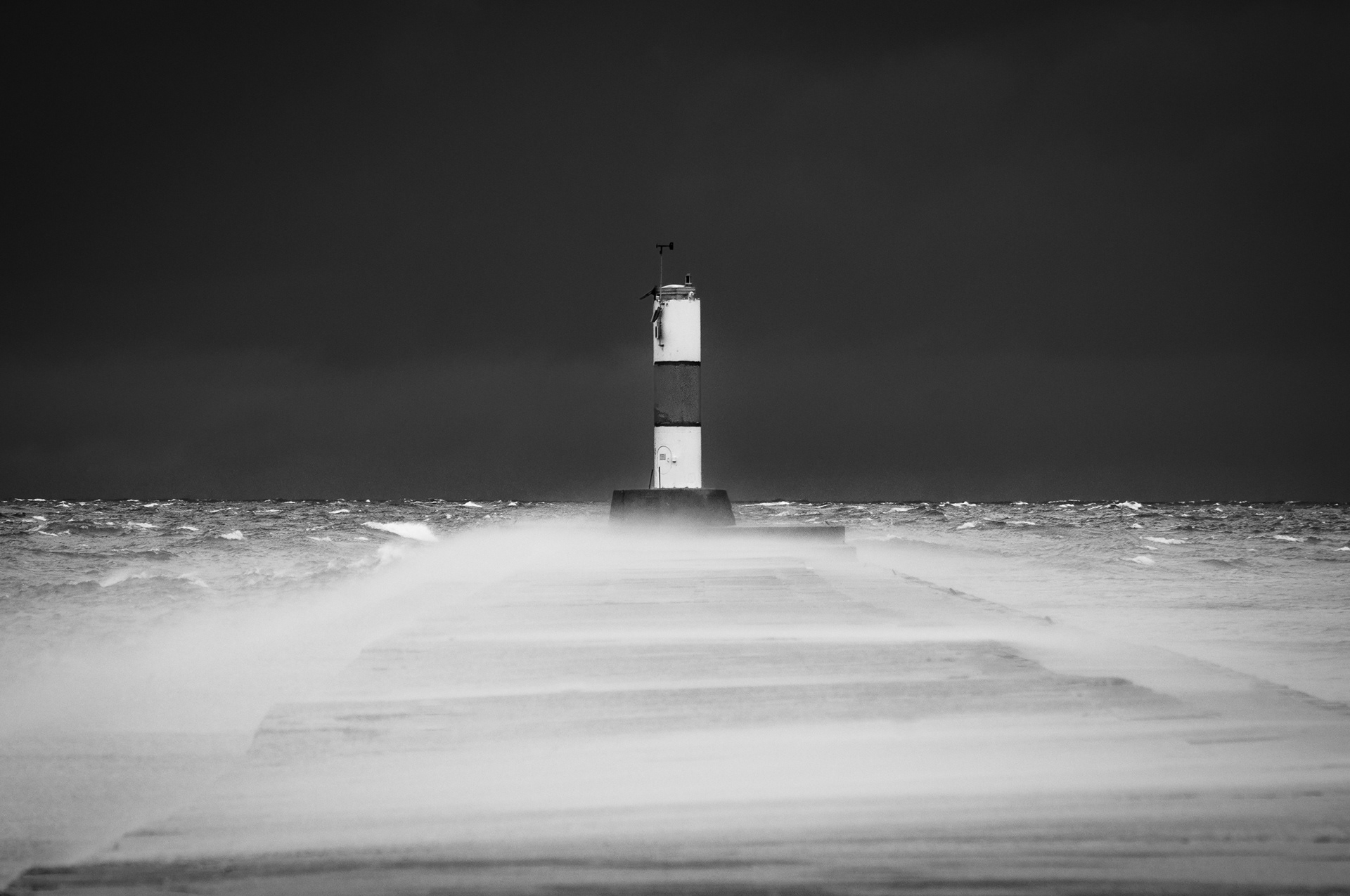 Grand Haven, November 2022. The Grand Haven North Breakwater. The very strong wind blows water from the channel across the breakwater. No filter was used. Exposure time: 1/500 second.