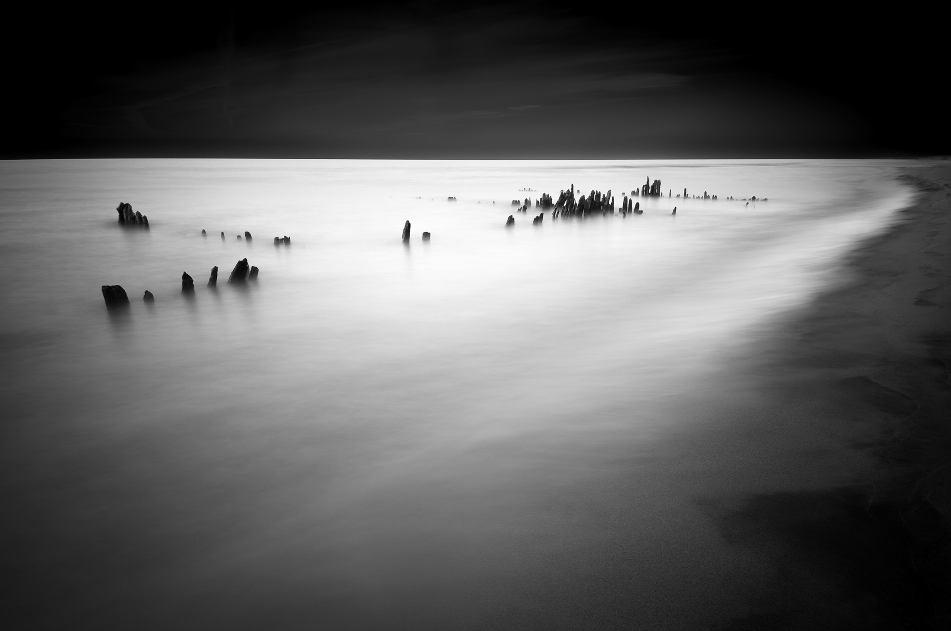 Kirk Park, November 2022. Random boards and posts sticking out of the water. Remnants of . . . I don't know what. Exposure time: 20 seconds.