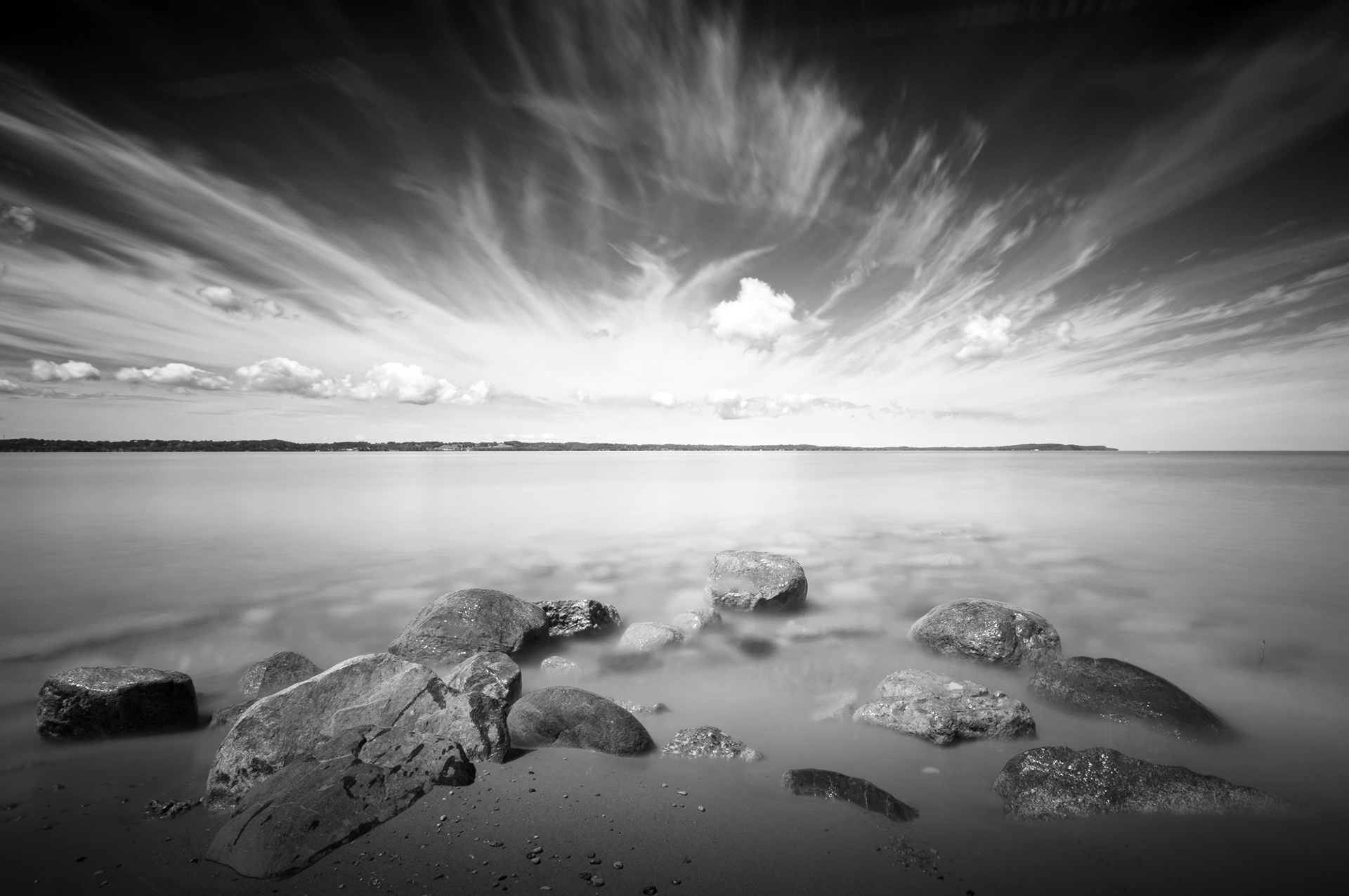 Elk Rapids, August 2022. Some "big sky" clouds over the East Arm of the Grand Traverse Bay. Taken at the south end of the beach. Exposure time: 20 seconds.