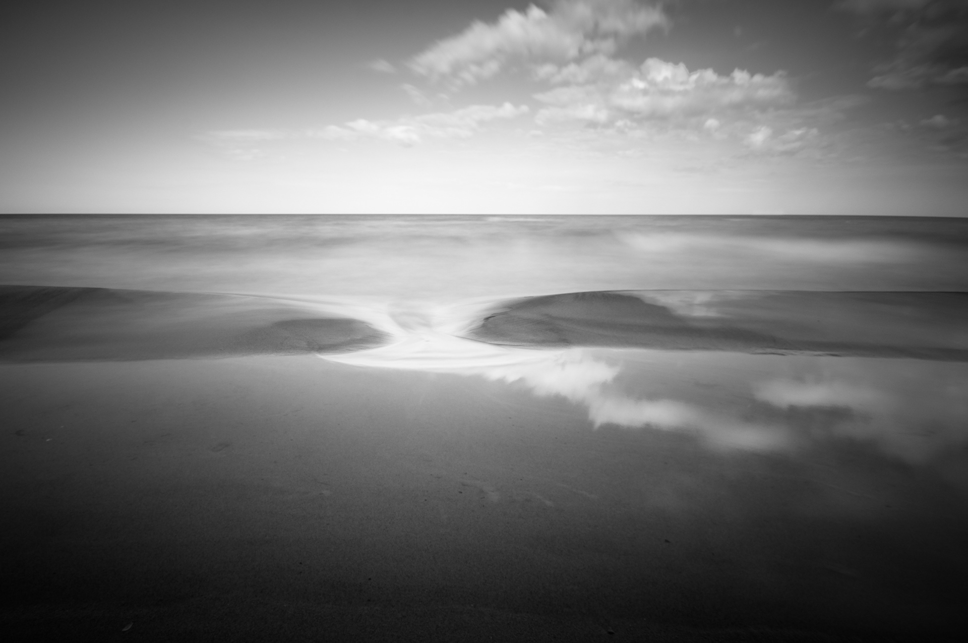 Saugatuck Dunes State Park, September 2019. Waves from Lake Michigan break past a sand bar and spill into a small pool of water. The rivulet merges with the reflection from the overhead clouds. Exposure time: 20 seconds.