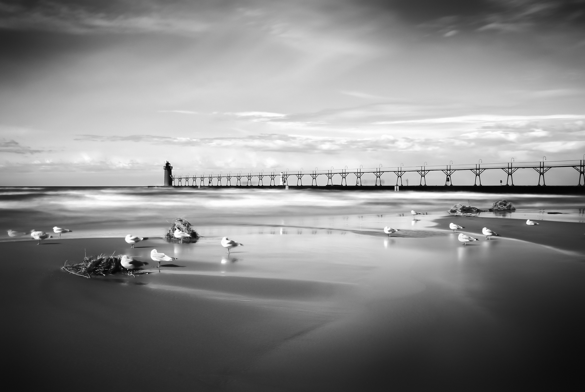 South Haven, October 2014. I stopped here on my way to Chicago. A strong wind from the west created a lot of wave action. The wind pushed the water well into the shore. The seagulls did not seem bothered by the wind, or by me. Exposure time: 15 seconds.